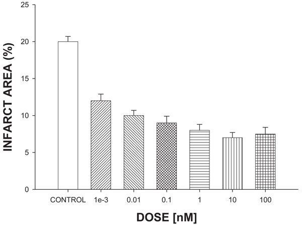 Amino-Steroid-Anthracenone derivative (ASA) against infarct area. The effect induced by ASA on ischemia-reperfusion injury (translated as infarction area*) was evaluated at a dose range of 0.001-100 nM.