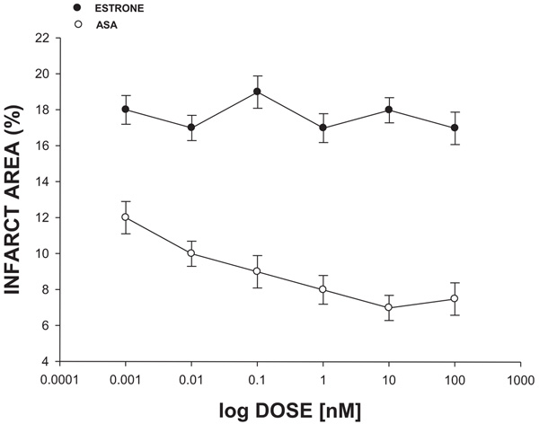The experimental data (Fig. 3) showed that the infarct area was significantly reduced (p = 0.05) in the presence of ASA compared with estrone in a dose-dependent manner (0.001 to 100 nM).