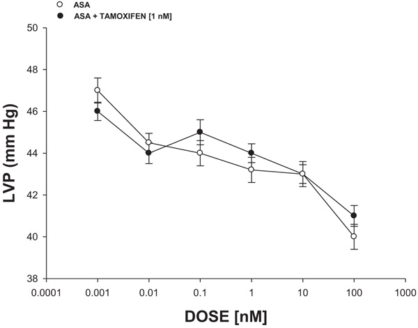Fig. 4 shows that ASA (0.001 to 100 nM) decreased the left ventricular pressure in a dose-dependent manner, both in the absence or the presence of tamoxifen (1 nM).