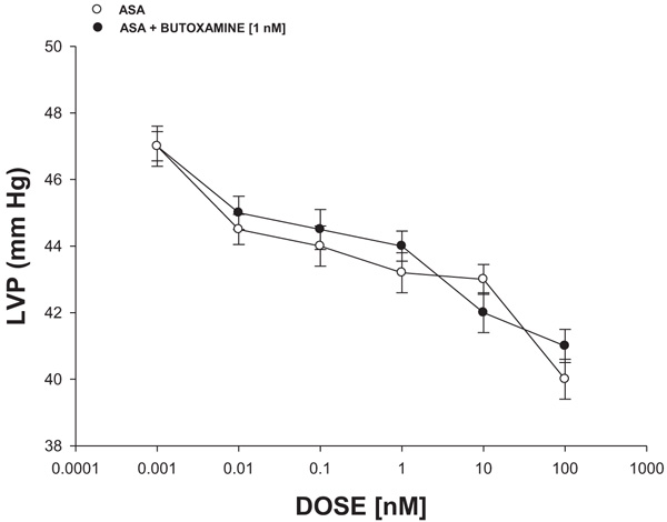 Intracoronary boluses (50 μL) of ASA (0.001 to 100 nM) were administered and the corresponding effect on the left ventricular pressure was determined. The dose-response curve (control) was repeated in the presence of butoxamine (β2-selective beta blocker) at a concentration of 1 nM (duration of pre-incubation with butoxamine was 10 min equilibration period).