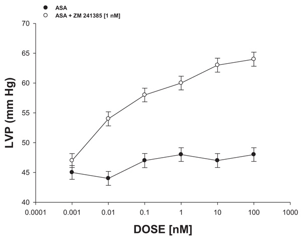 The boluses (50 μL) of ASA (0.001 to 100 nM) were administered and the corresponding effect on the left ventricular pressure was evaluated. The bolus injection administered was done at the point of cannulation. The dose-response curve (control) was repeated in the presence of ZM-241,385 (adenosine A2 antagonist) at a concentration of 1 nM (duration of the pre-incubation with ZM-241,385 was for a period of 10 min).